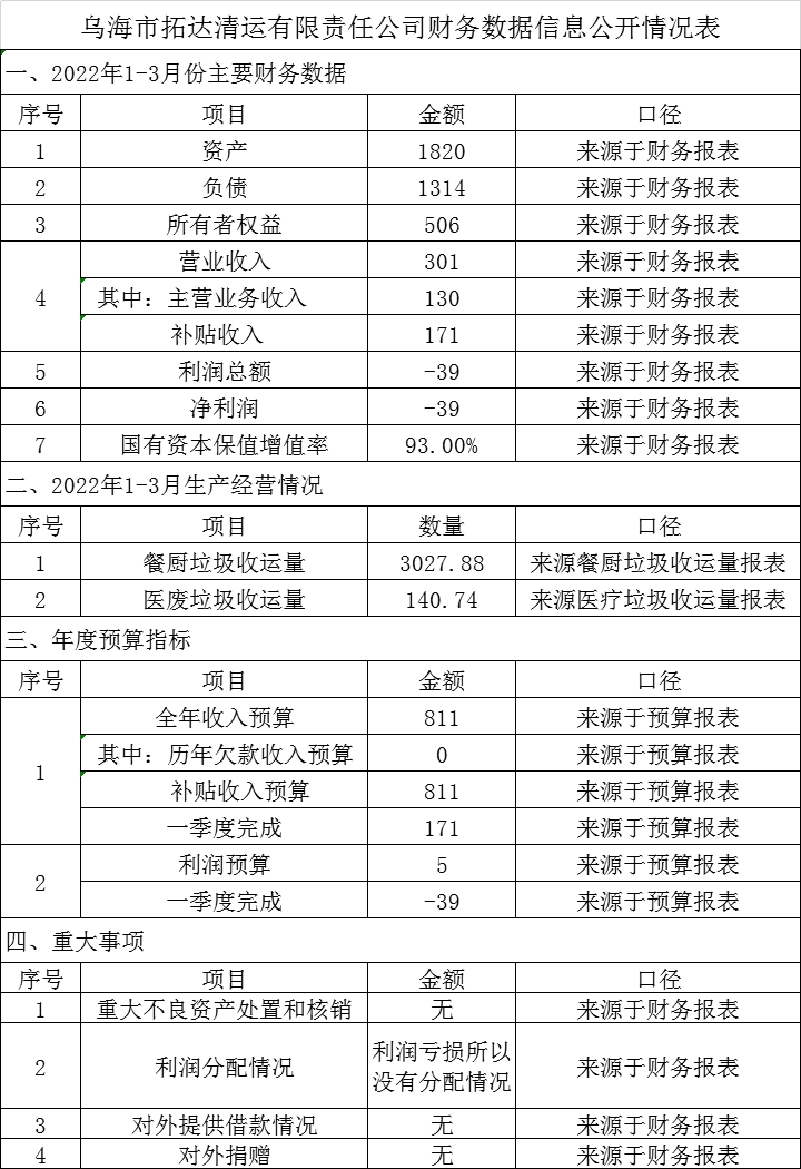 烏海市拓達(dá)清運(yùn)有限責(zé)任公司2022年第一季度信息公開(kāi)報(bào)告