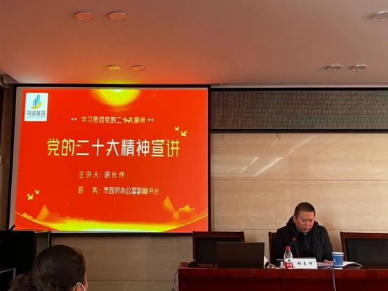 2023年1月18日,市政府辦公室副秘書長胡長偉到市城投集團公司開展學習宣傳貫徹黨的二十大精神宣講,市城投集團黨委書記郝關峰主持會議,集團公司領導班子成員,集團公司各部室正、副部長,機關黨支部全體黨員,各直屬黨組織書記及工作人員參加了本次宣講活動。