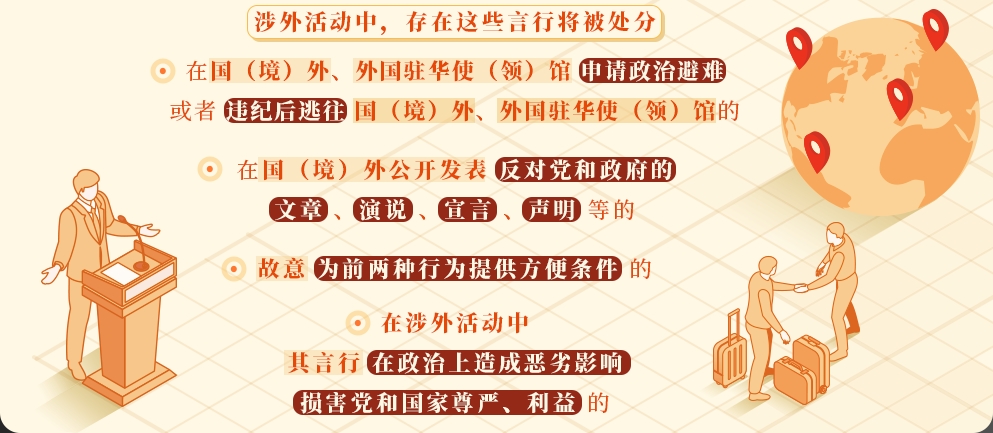 涉外活動關(guān)系黨和國家的尊嚴和榮譽,具有很強的政治性。《中國共產(chǎn)黨紀律處分條例》第七十二條、七十三條對涉外活動中存在有政治問題的言行作了處分規(guī)定,主要有以下幾類:1.在國(境)外、外國駐華使(領(lǐng))館申請政治避難,或者違紀后逃往國(境)外、外國駐華使(領(lǐng))館的,給予開除黨籍處分。所謂“申請政治避難”,一般指黨員以所謂“政治原因”為借口,逃往國(境)外或外國駐華使(領(lǐng))館,申請取得居留權(quán)并居住在國(境)外或者外國駐華使(領(lǐng))館。“違紀后逃往國(境)外、外國駐華使(領(lǐng))館的”,一般指違紀黨員為逃避紀律處分,逃往國(境)外、外國駐華使(領(lǐng))館。無論是向外國申請政治避難,還是違紀后逃往國(境)外,都表明該黨員已徹底背叛黨的事業(yè),喪失了共產(chǎn)黨員條件,應(yīng)當給予開除黨籍處分。2.在國(境)外公開發(fā)表反對黨和政府的文章、演說、宣言、聲明等的,給予開除黨籍處分。黨員在國(境)外公開發(fā)表反對黨和政府的言論,同樣表明其已徹底背叛了黨的事業(yè),喪失了共產(chǎn)主義信仰和共產(chǎn)黨員應(yīng)具備的條件,應(yīng)當受到最嚴厲的紀律處分。3.故意為前兩種行為提供方便條件的,給予留黨察看或者開除黨籍處分?!疤峁┓奖銞l件”,主要指為申請政治避難、外逃或者在國(境)外公開發(fā)表反動言論等提供各種有利條件,如為其開具證明、代辦護照簽證、幫助購買車船機票、提供經(jīng)濟幫助、提供落腳點、提供發(fā)表反動言論的平臺,等等。4.在涉外活動中,其言行在政治上造成惡劣影響,損害黨和國家尊嚴、利益的,給予撤銷黨內(nèi)職務(wù)或者留黨察看處分;情節(jié)嚴重的,給予開除黨籍處分。此類違紀行為包括兩個條件:一是該行為發(fā)生在涉外活動中;二是在政治上造成惡劣影響,損害黨和國家尊嚴、利益。無論什么時候,黨員干部都要切實增強政治敏銳性,在涉外活動中以良好精神風貌和舉止言行維護黨和國家形象,堅決防范有政治問題的言行。