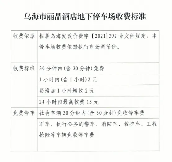 為緩解地面停車壓力,引導(dǎo)車輛有序停放,烏海市濱河九中地下停車場與麗晶國際酒店地下停車場已完成智能化升級改造。2024年7月25日經(jīng)海勃灣區(qū)城市管理綜合執(zhí)法局批準(zhǔn),兩個停車場于近期正式開展停車收費(fèi)管理,收費(fèi)標(biāo)準(zhǔn)見下表: