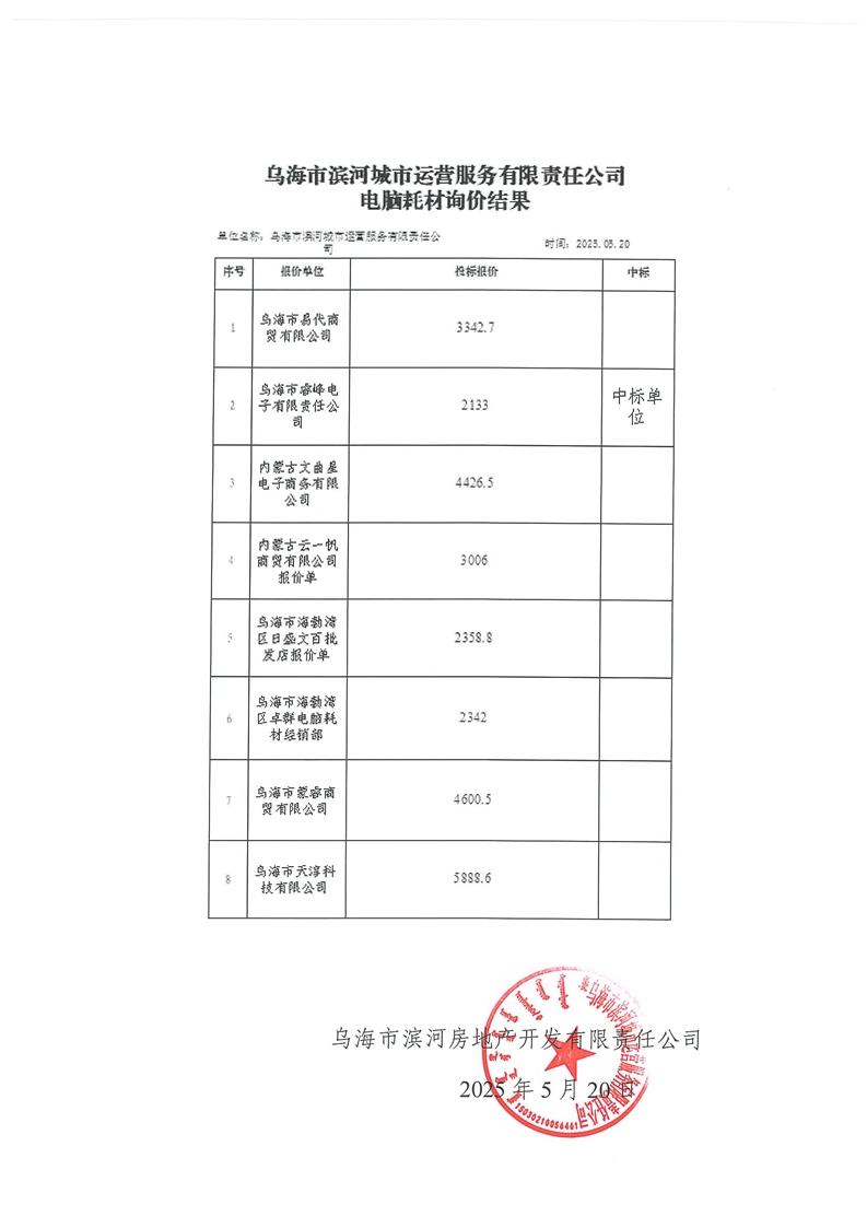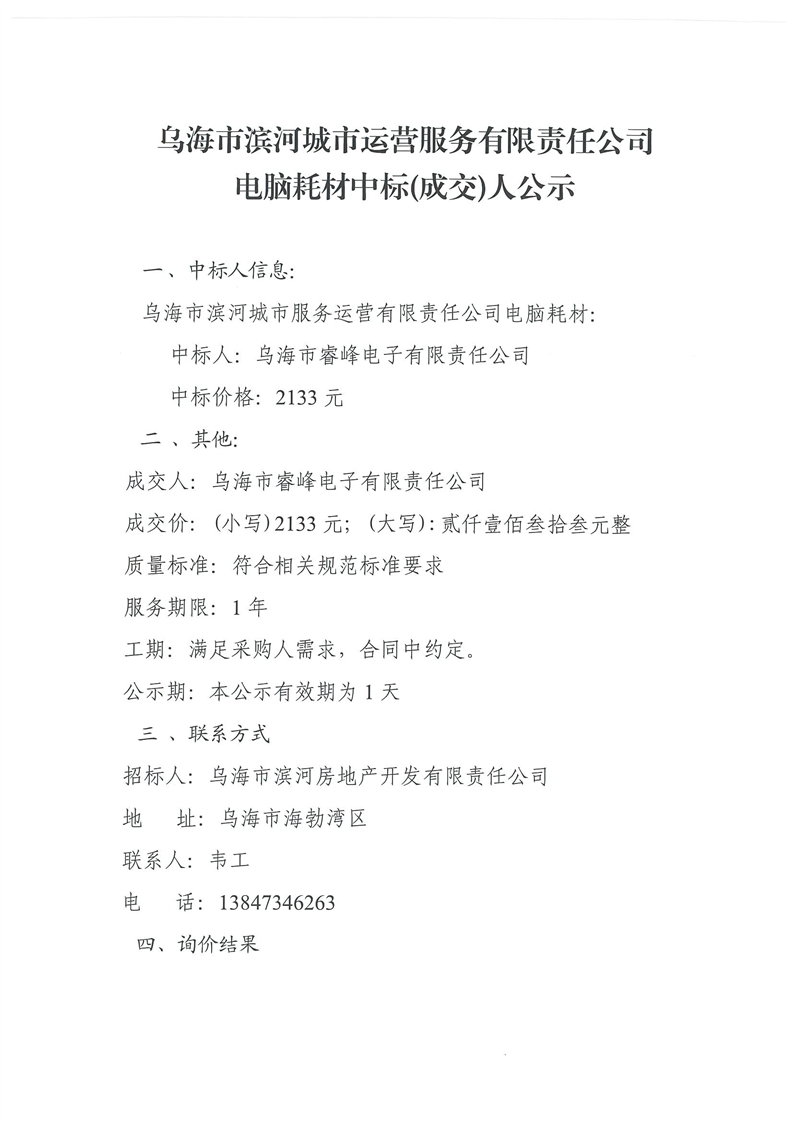 烏海市濱河城市運(yùn)營服務(wù)有限責(zé)任公司辦公用品耗材中標(biāo)(成交)人公示