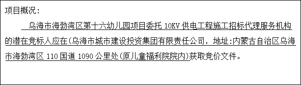 項目名稱:烏海市海勃灣區(qū)第十六幼兒園項目委托10KV供電工程施工招標(biāo)代理服務(wù)機(jī)構(gòu)