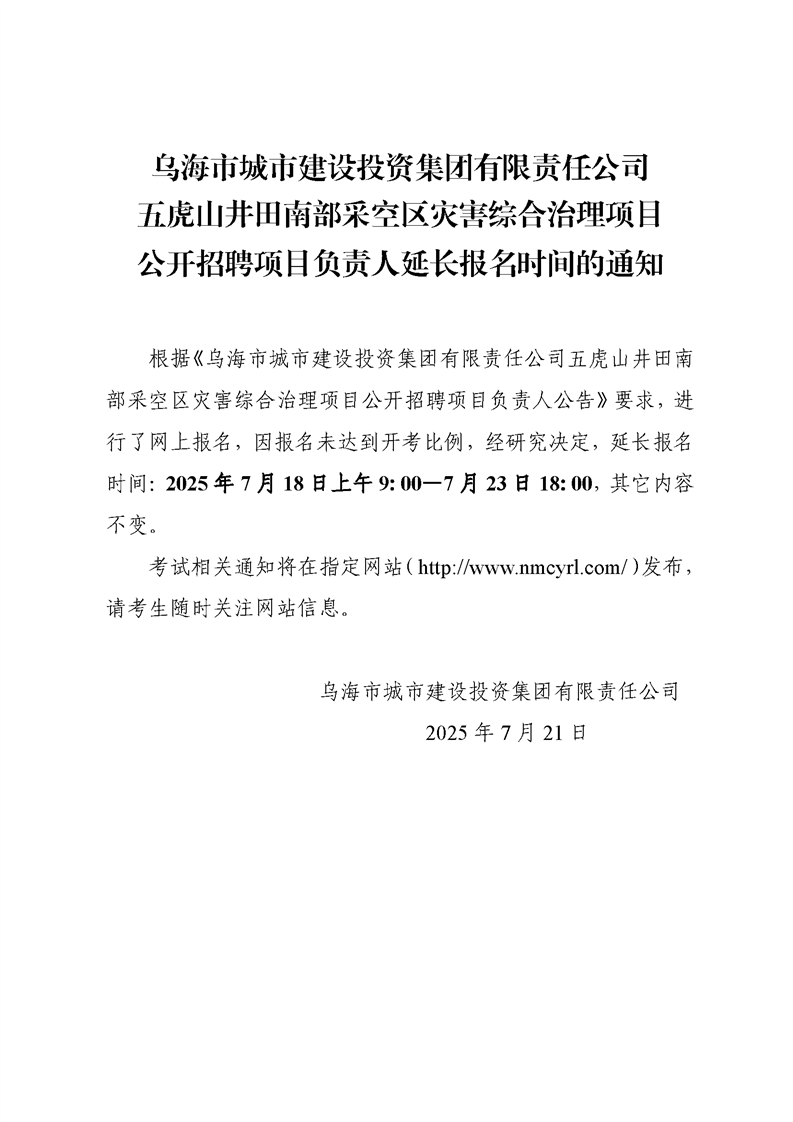 烏海市城市建設投資集團有限責任公司五虎山井田南部采空區(qū)災害綜合治理項目公開招聘項目負責人延長報名時間的通知