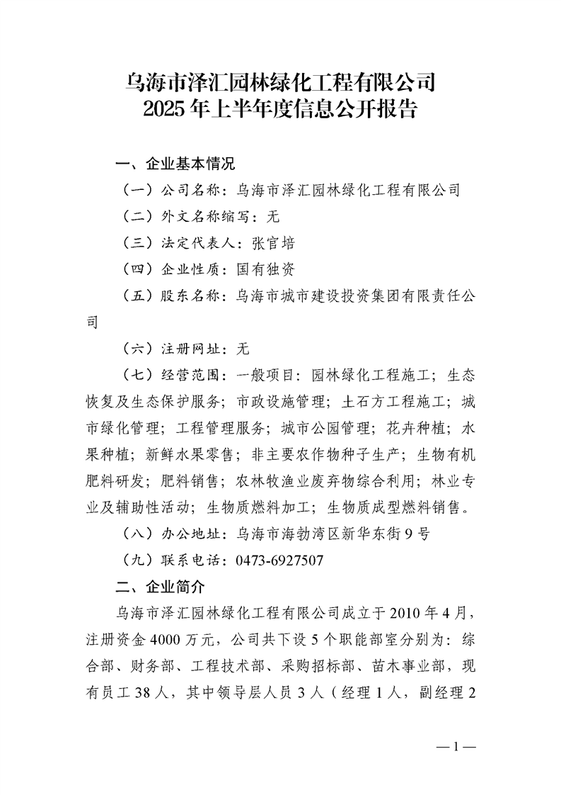 - 2025-03-10烏海市澤匯園林綠化工程有限公司2024年度信息公開報告