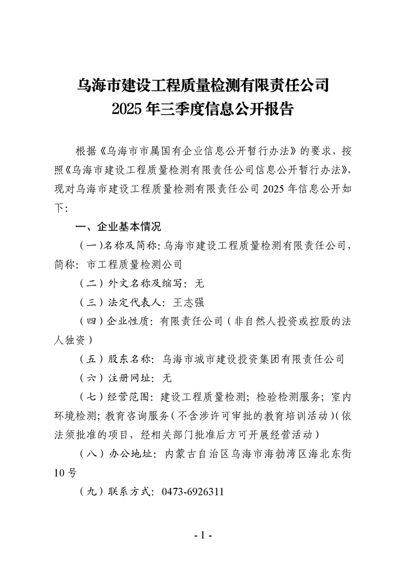 - 2025-07-28烏海市建設工程質(zhì)量檢測有限責任公司2025年二季度信息公開