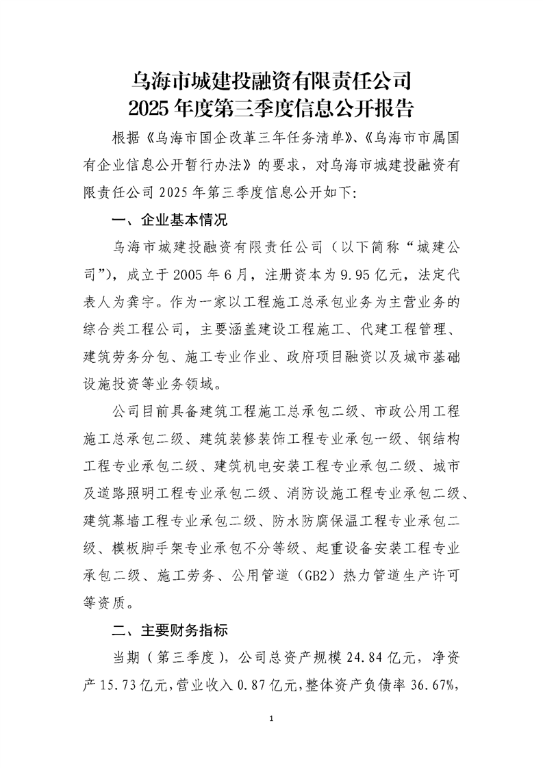 - 2025-07-28烏海市城建投融資有限責任公司2025年度第二季度信息公開
