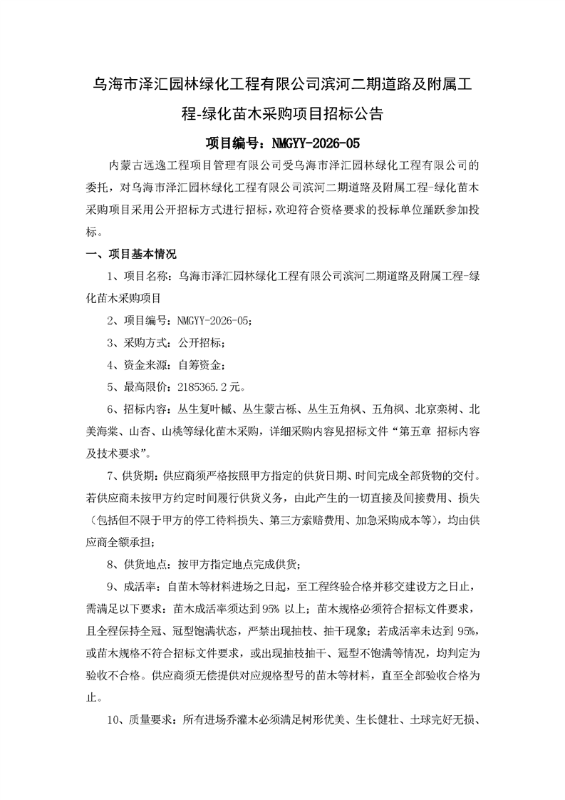 烏海市澤匯園林綠化工程有限公司濱河二期道路及附屬工程-綠化苗木采購項(xiàng)目招標(biāo)公告