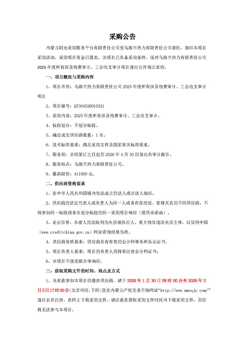 - 2026-02-13烏海市熱力有限責(zé)任公司2025年度所有涉及稅費(fèi)審計、工會收支審計采購項(xiàng)目結(jié)果公示
